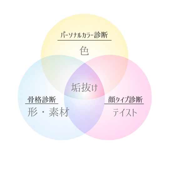 垢抜けフルコースでは、パーソナルカラー・顔タイプ・骨格診断の3つを掛け合わせて、あなたの魅力を一番引き出す「正解」を明確に、日常で活かせる形まで落とし込みます。
